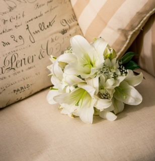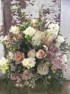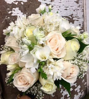 Natural stem posy style and our florist will match it to whichever option the bride has chosen in the colours of brides choice. Finished off with your choice of green or silver foliage and brides choice